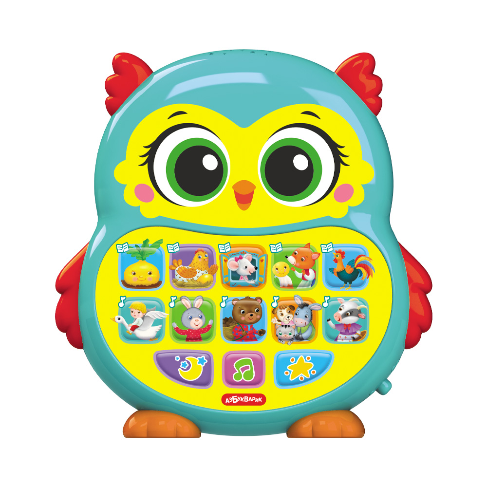 Забавная Совушка непременно порадует малыша песенками-потешками («Идёт коза рогатая», «Два весёлых гуся», «Зайчик серенький сидит», «Петушок», «Во саду ли, в огороде», «Ладушки» и другие) в сопровождении мигающих огоньков.